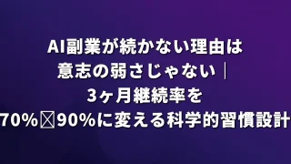 💡 ポイントAI副業の最大のメリットは「時間の投資対効果」です。従来手法の3分の1の時間で同品質のコンテンツを作れるため、忙しい会社員でも継続しやすいのが特徴です。